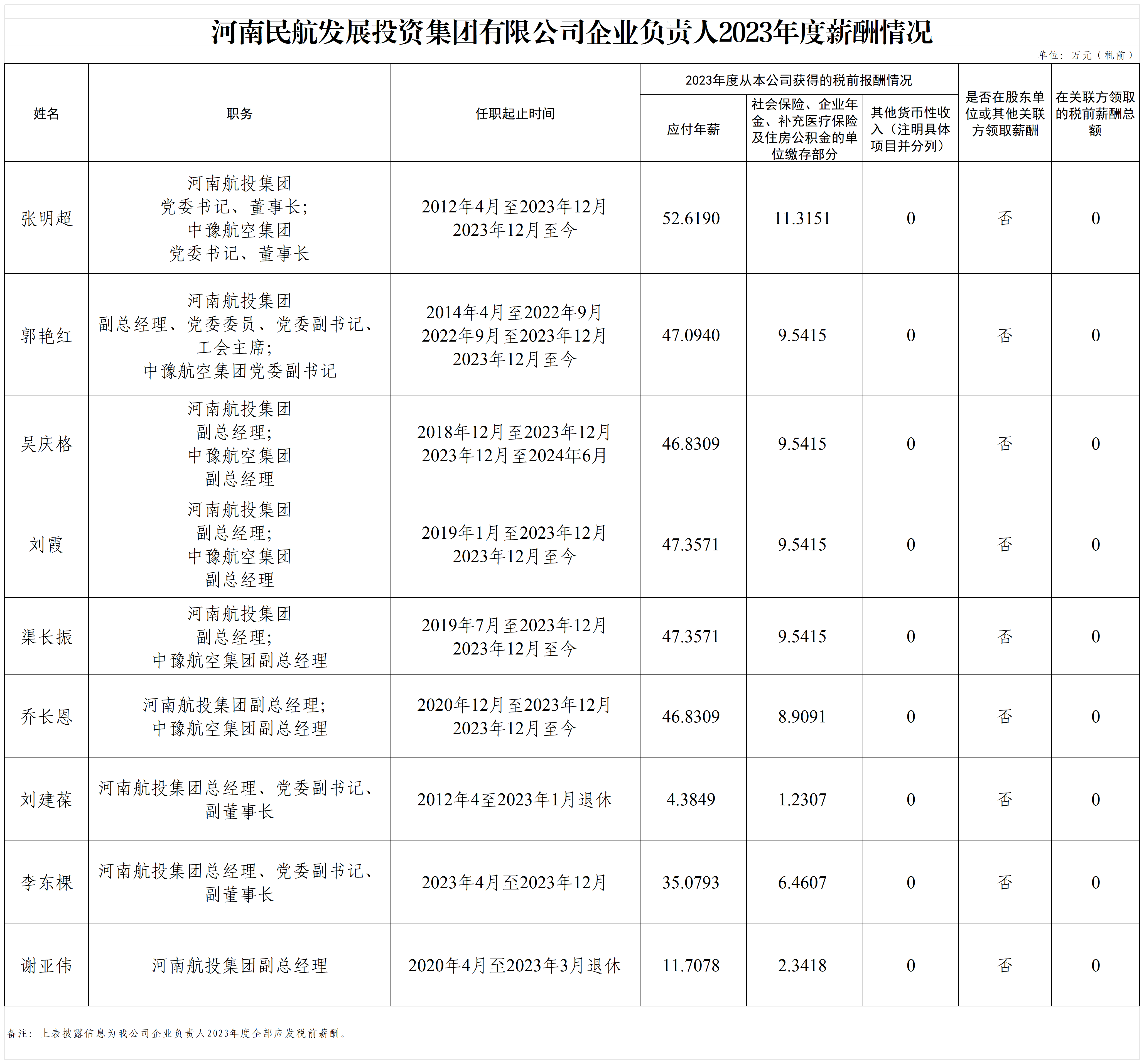 河南民航發(fā)展投資集團有限公司企業(yè)負責人2023年度薪酬情況